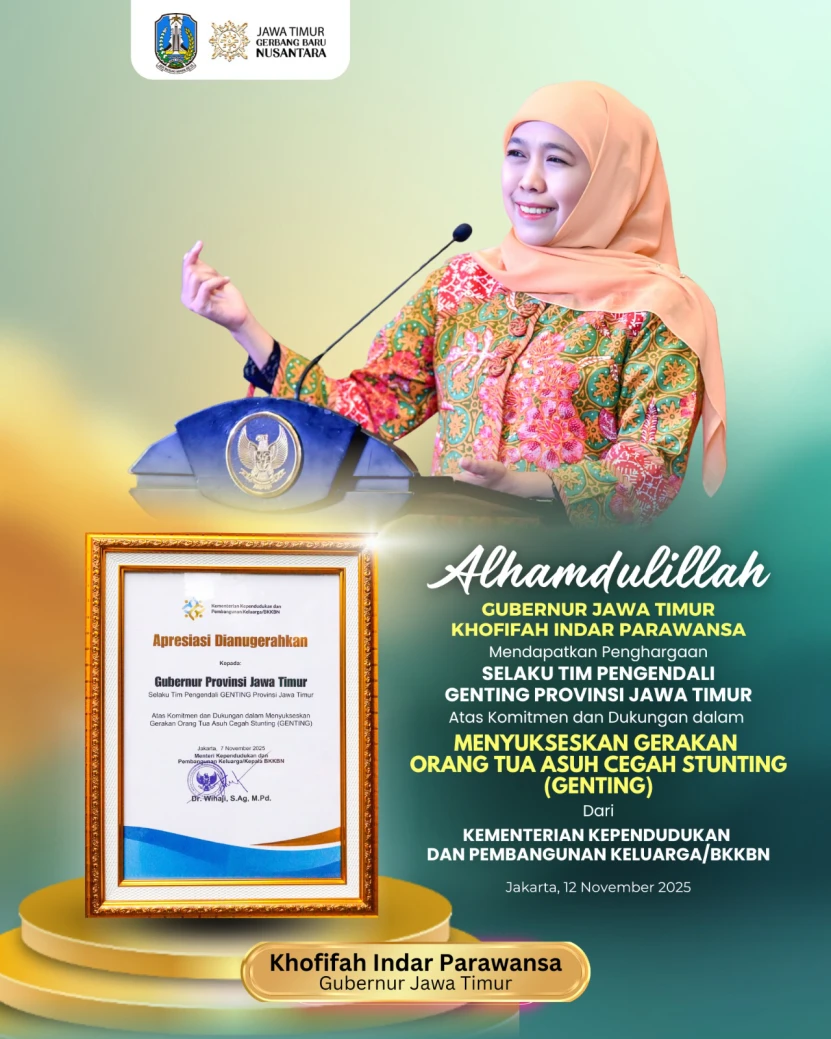 UPDATECEPAT.COM – Keberhasilan Gubernur Jawa Timur Khofifah Indar Parawansa secara aktif bersinergi menurunkan stunting dan melaksanakan program ‘Genting’ atau Gerakan Orang Tua Asuh Cegah Stunting mendapatkan apresiasi dari Kementerian Kependudukan dan Pembangunan Keluarga/BKKBN.