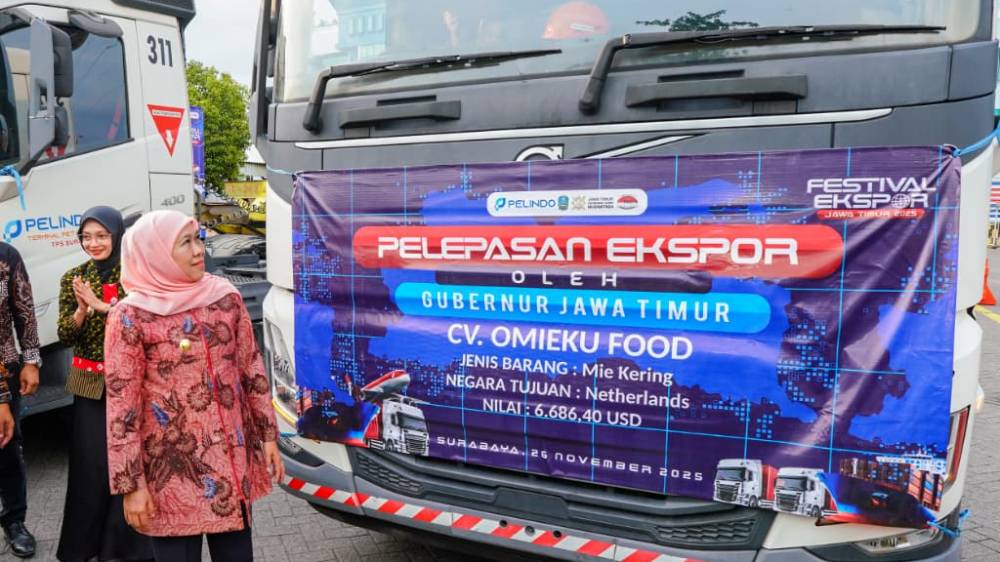UPDATECEPAT.COM – SURABAYA, 27 NOVEMBER 2025 – Gubernur Jawa Timur Khofifah Indar Parawansa melepas enam truk produk ekspor Industri Kecil Menengah (IKM) Desa Devisa Jawa Timur dengan nilai total USD351,6 ribu atau setara Rp5,8 miliar. Pelepasan dilakukan dalam gelaran Festival Ekspor Jawa Timur 2025 yang berlangsung di PT Terminal Petikemas Surabaya (TPS), Rabu (26/11).