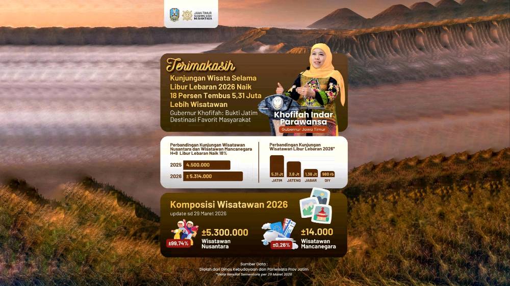 Total wisatawan yang mengunjungi berbagai destinasi di Jawa Timur tercatat mencapai sekitar 5.314.000 orang. Angka tersebut masih berpotensi bertambah hingga akhir periode libur Lebaran pada 5 April 2026.