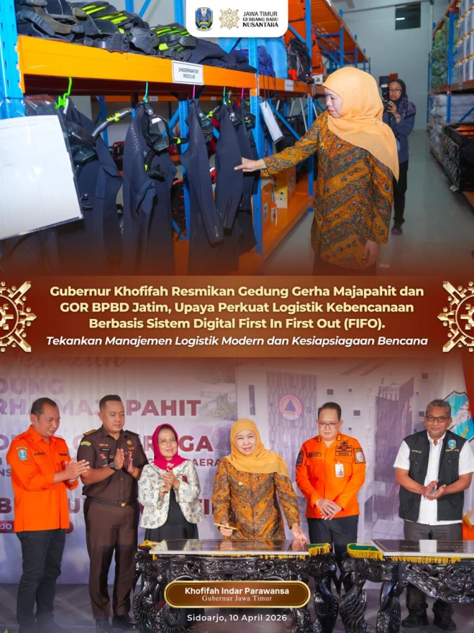 UPDATECEPAT.COM – SIDOARJO, 10 April 2026 – Gubernur Jawa Timur Khofifah Indar Parawansa meresmikan Gedung Gerha Majapahit dan Gedung Olahraga Badan Penanggulangan Bencana Daerah (BPBD) Provinsi Jawa Timur di Kantor BPBD Jatim, Kabupaten Sidoarjo, Kamis (9/4).