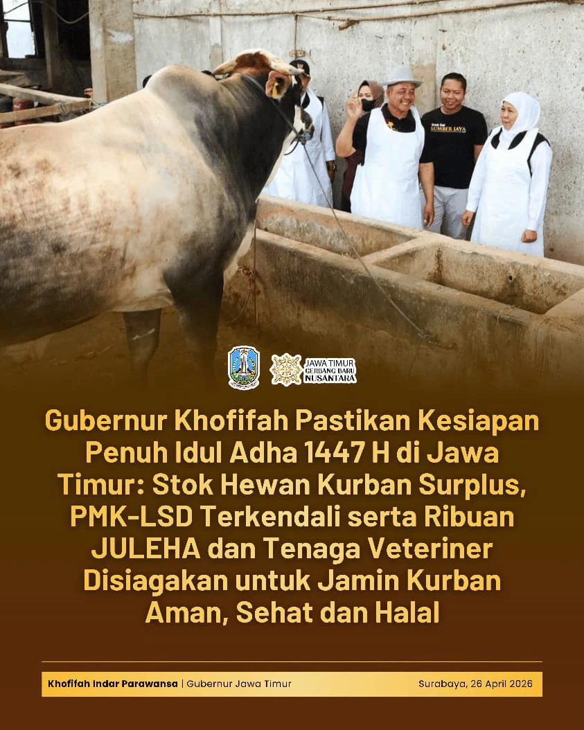 UPDATECEPAT.COM – SURABAYA, 27 APRIL 2026 – Gubernur Jawa Timur Khofifah Indar Parawansa memastikan kesiapan penuh pelaksanaan pemotongan hewan kurban pada Hari Raya Idul Adha 1447 H/2026 M di seluruh wilayah Jawa Timur.
